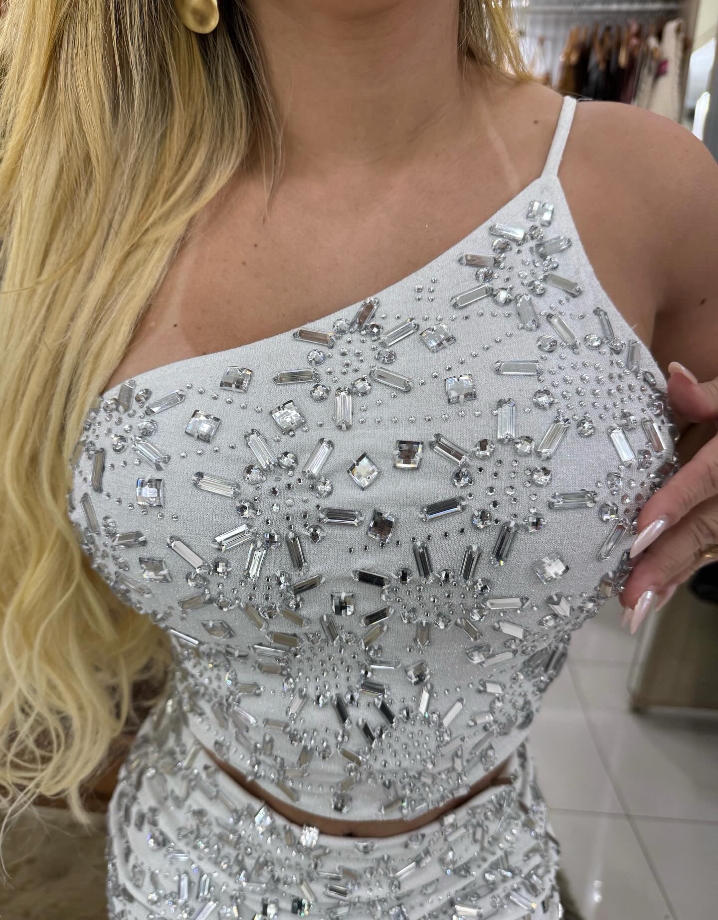 Um look que é puro glamour! O conjunto branco com recortes modernos e aplicação de brilho traz sofisticação e estilo na medida certa. O top de um ombro só valoriza o colo e a cintura, enquanto a saia curta realça as curvas com elegância.