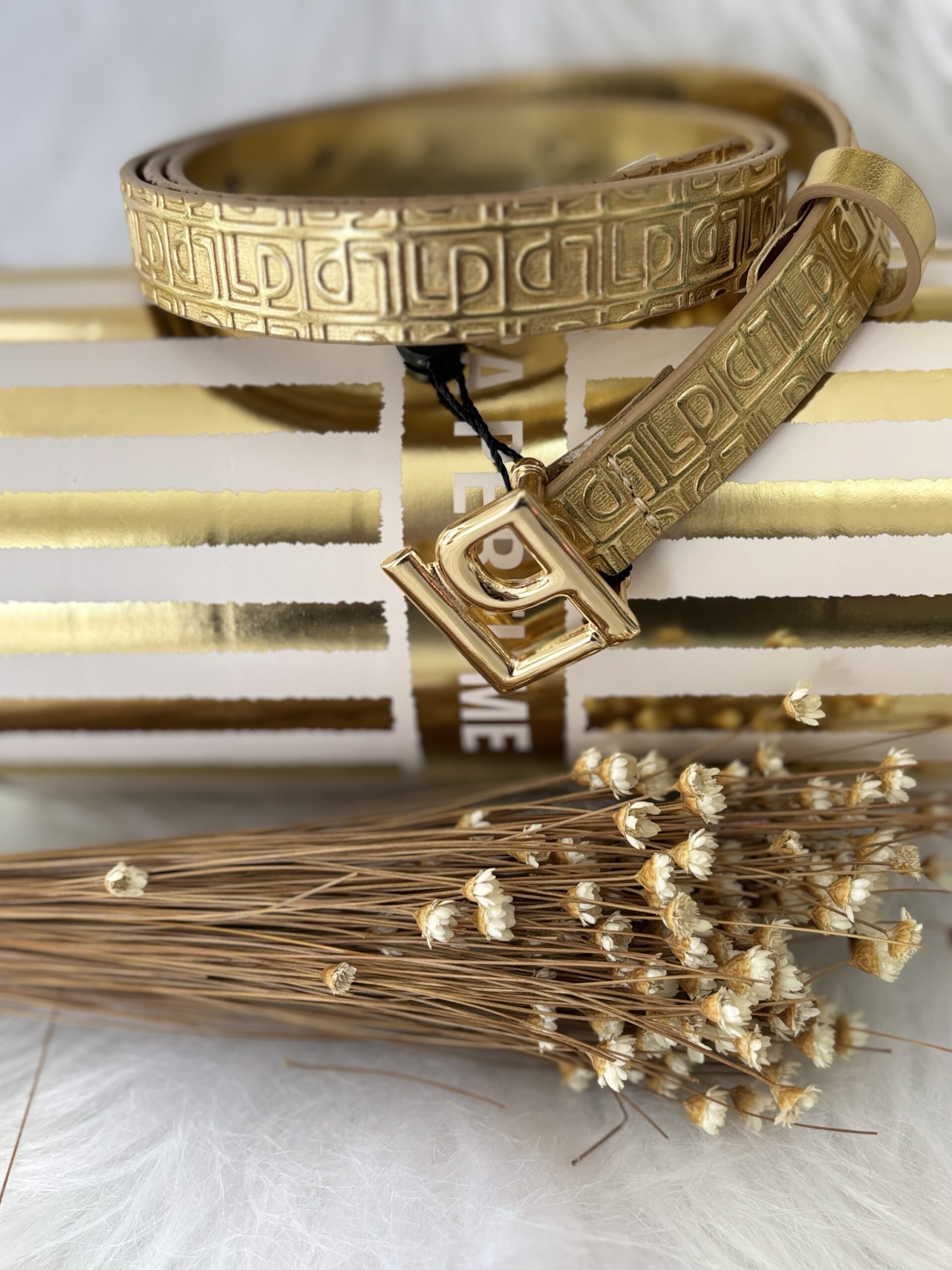 A fivela em metal dourado, desenhada com as icônicas letras “LP”, é a estrela da peça, exalando um brilho sofisticado que capta a luz e a atenção.