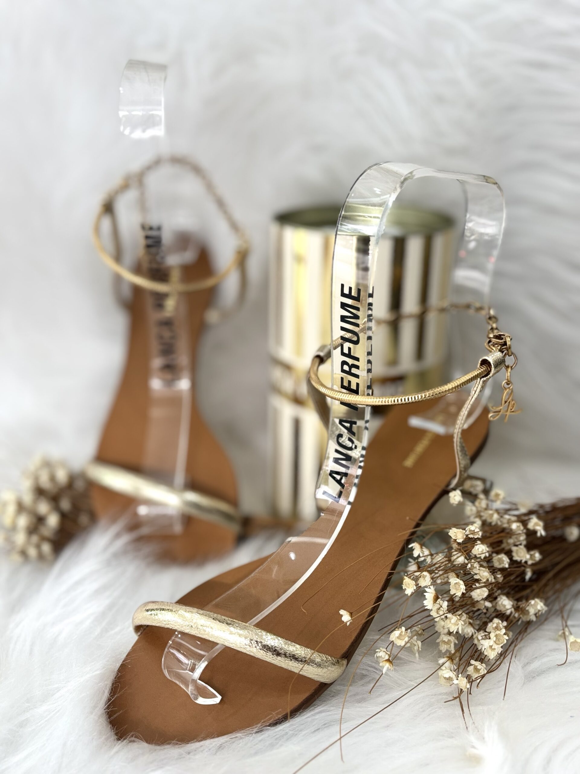 • Efeito Nude e Glamour: A tira principal em vinil, com a logomania Lança Perfume em dourado, cria um elegante efeito “desaparecendo” no pé, enquanto o detalhe da delicada corrente dourada e o pingente LP no tornozelo elevam instantaneamente a produção a um patamar high-fashion.