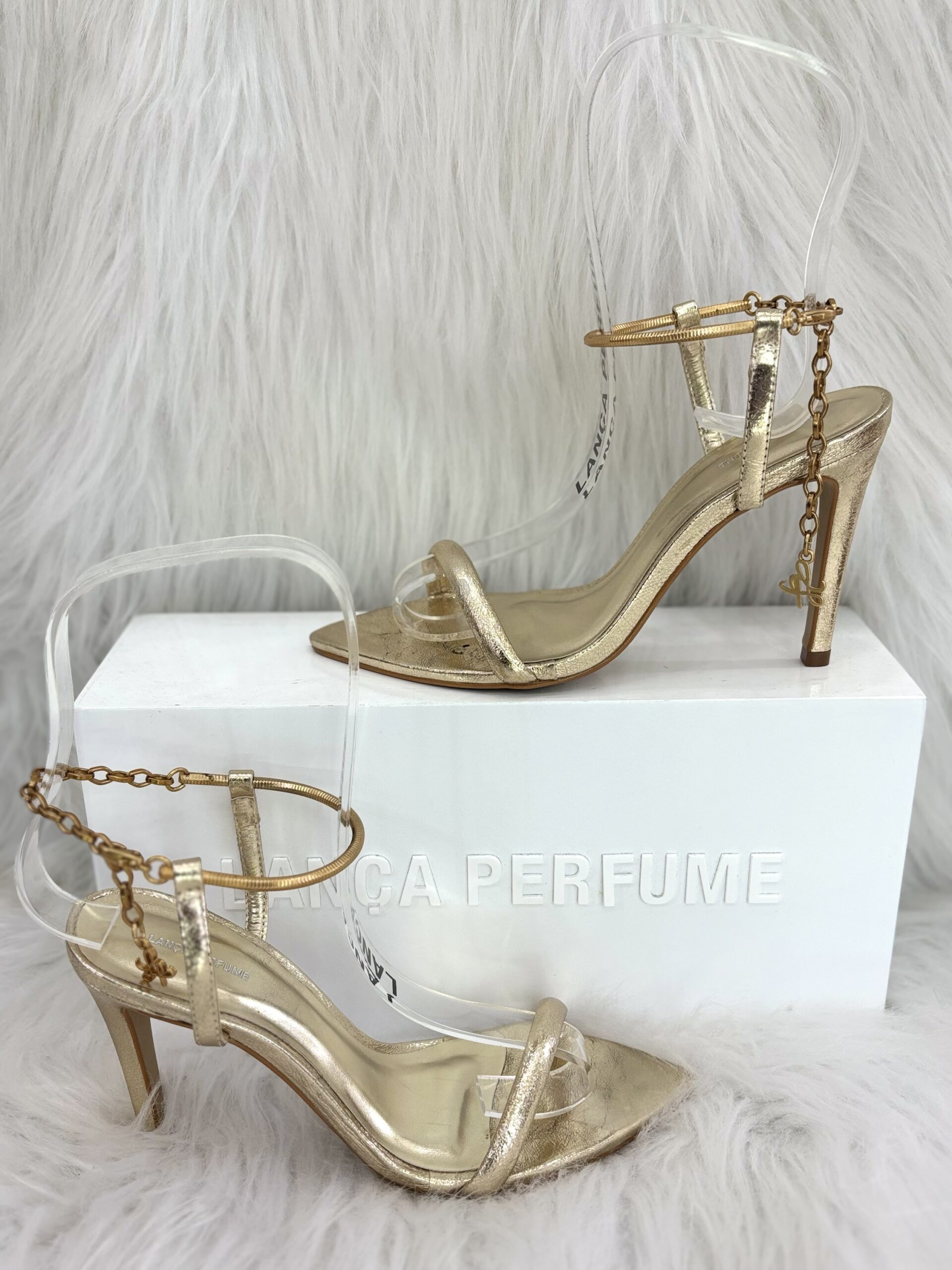 Esta deslumbrante sandália de salto fino da Lança Perfume é a definição de elegância com um toque de ousadia. O modelo se destaca pelas tiras delicadas, que envolvem o pé com sofisticação, e o detalhe marcante da corrente metálica dourada que adorna o tornozelo, conferindo um charme extra e um toque luxuoso.