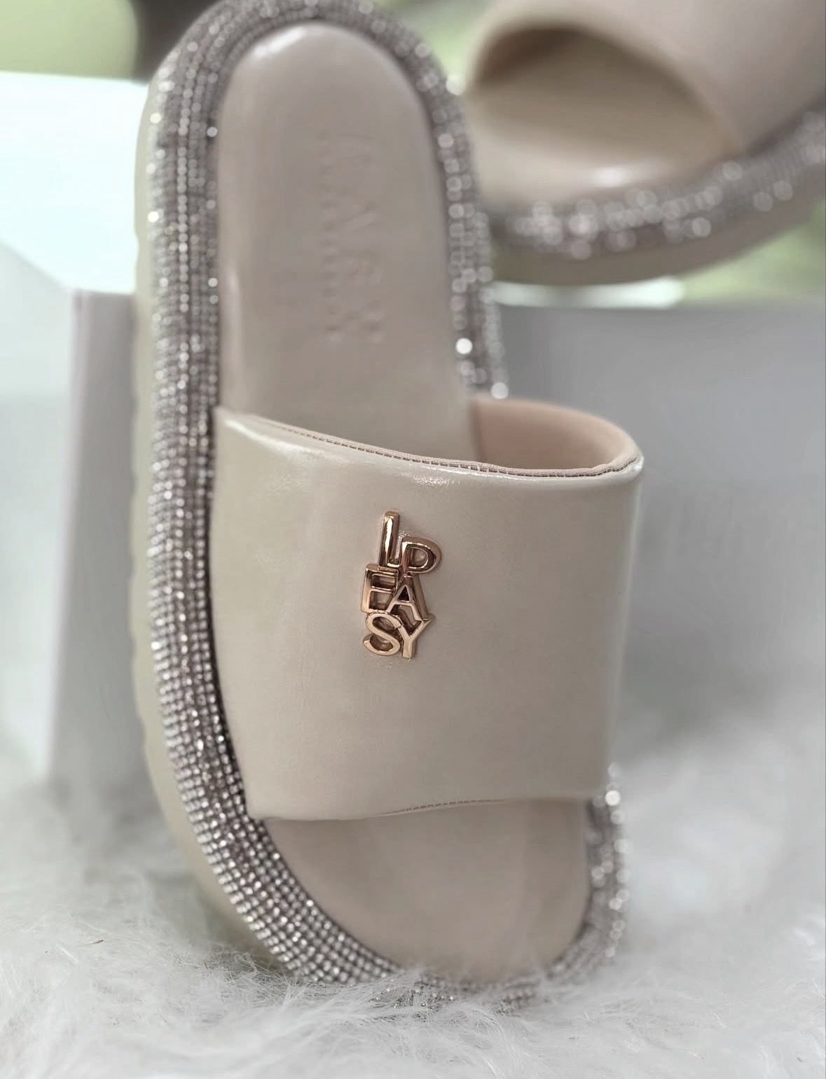 O modelo combina a praticidade do chinelo slide com um design delicado na cor nude/bege, apresentando uma tira superior macia e acolchoada. A característica mais charmosa e estilosa é o solado adornado com um contorno completo de strass, que adiciona um brilho glamouroso. O logo metálico dourado na tira complementa o visual. É a peça perfeita para adicionar conforto e um charme fashion aos seus momentos de lazer.
