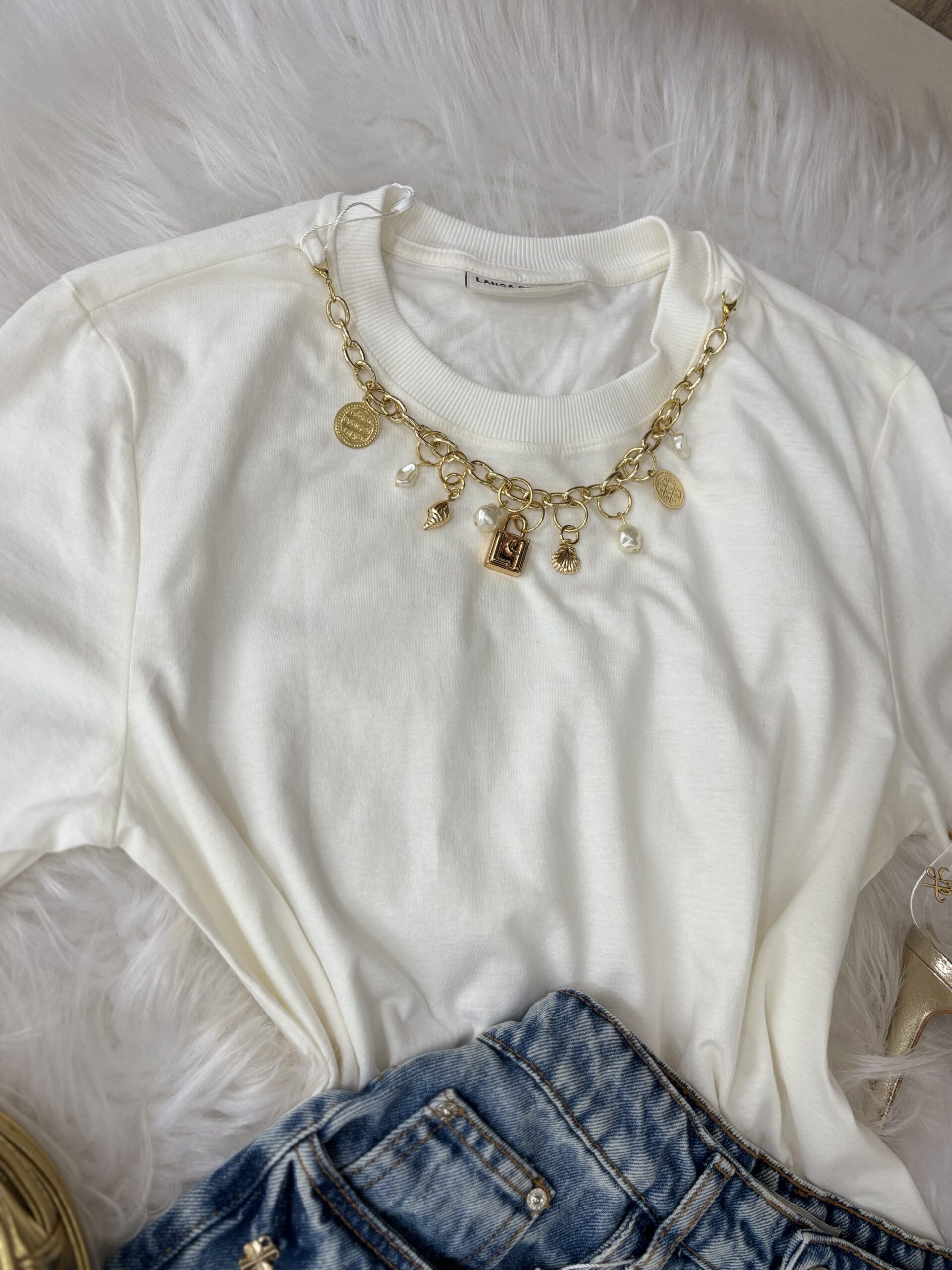• Sugestão de Styling: Acompanhada por um colar statement em elos dourados e charms que remetem a cadeados e medalhas, ela transita com maestria do casual chic ao look de impacto para a noite. Combine com alfaiataria de cintura alta, saias midi de seda ou um jeans premium para um visual “effortless chic”.
