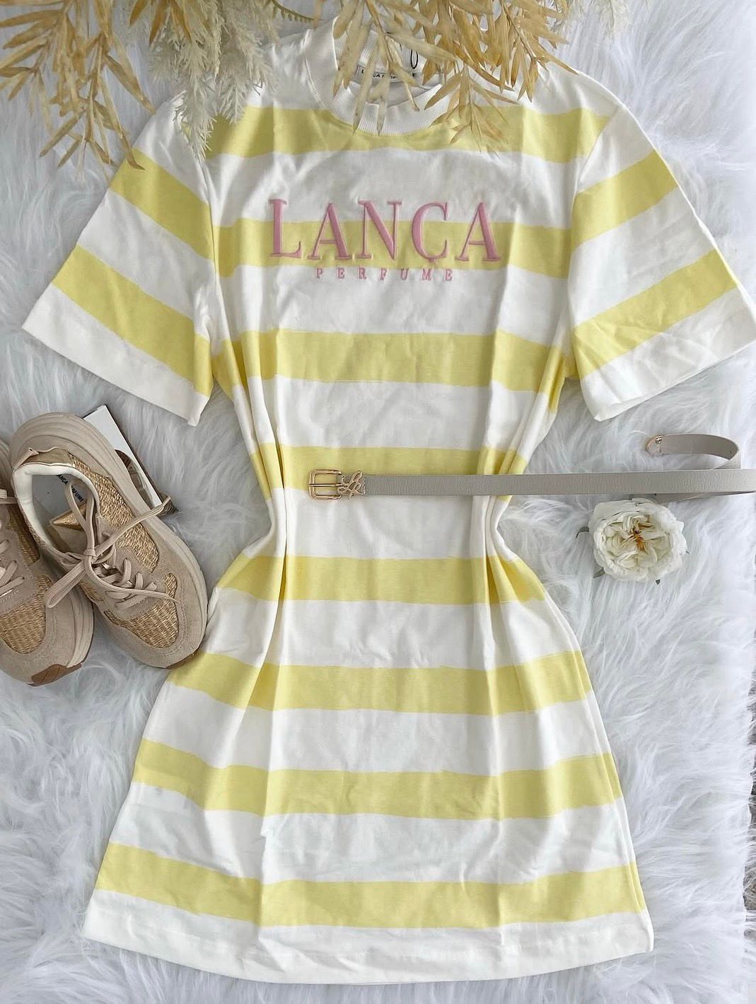A peça ideal para um visual descontraído e moderno! Esta t-shirt long em listras branco e amarelo claro une o conforto da malha à tendência street style. Use solto para um look oversized ou como na foto, com cinto, para definir a silhueta e transformá-lo em um minivestido super estiloso. Essencial para seus dias de sol!
